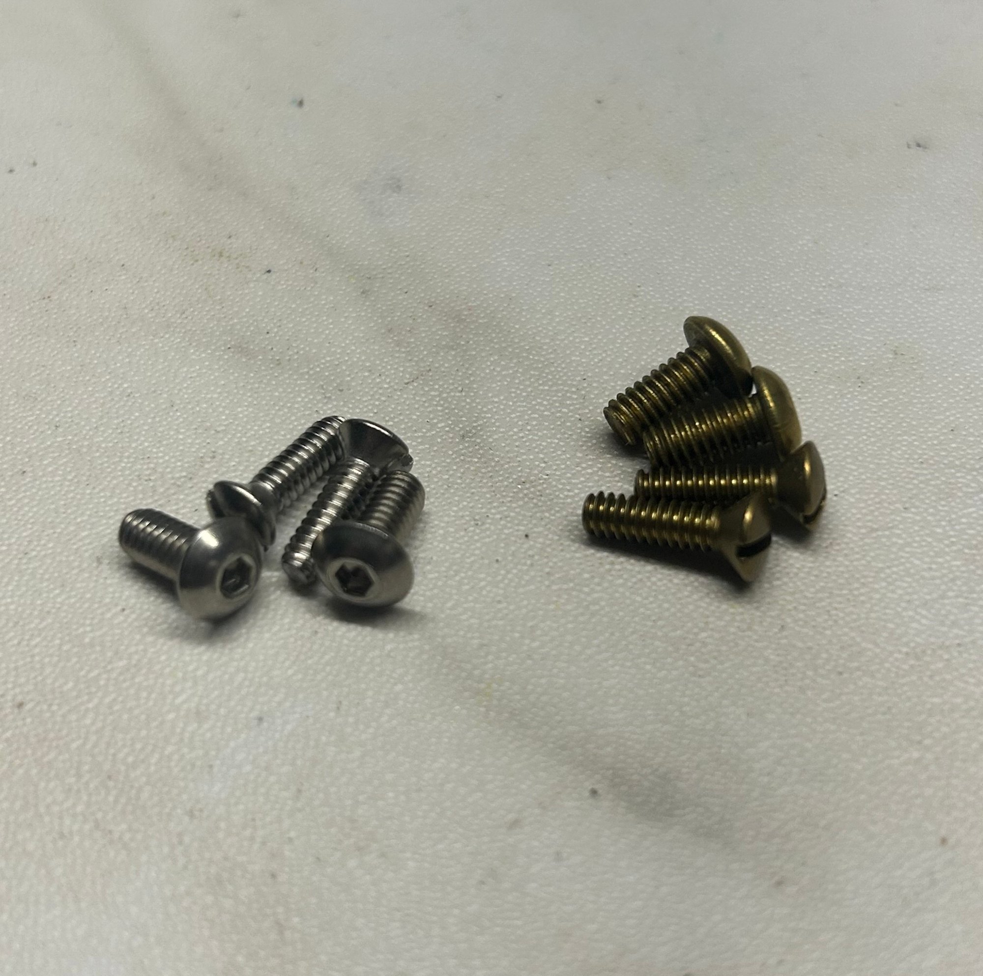 Screw set include two grip panel screws (same size) and two trigger frame screws (different sizes). You can order them in either corrosion resistant Brass or 18-8 Stainless Steel. The front trigger frame screw is longer due to the thickness of the frame and need to fully restrain cartridge valves. The rear screw is shorter to avoid potential interference with the hammer spring.